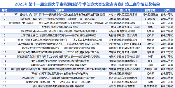 全国学生能源经济学术创意大赛由中国优选法统筹法与经济数学研究会主办,2023年列入《全国普通高校大学生竞赛目录》,是国内能源经济领域规格最高、影响力最广的学术竞赛之一。本届大赛聚焦能源经济转型中的前沿议题,评审团由厦门大学、武汉大学、合肥工业大学、安徽财经大学等12位权威专家组成,从创新性、实践价值、社会效益等维度对作品进行多轮盲审。在与中国科学技术大学、合肥工业大学、安徽大学等“双一流”高校的激烈竞争中,我校学子凭借跨学科融合与扎实研究脱颖而出。18项获奖作品紧扣“双碳”战略与乡村振兴,涵盖绿色金融、新能源技术等领域,以多学科交叉、数据驱动为核心,融合产学研实践,凸显了我校“新文科”建设中“跨界融合、服务战略”的育人导向。